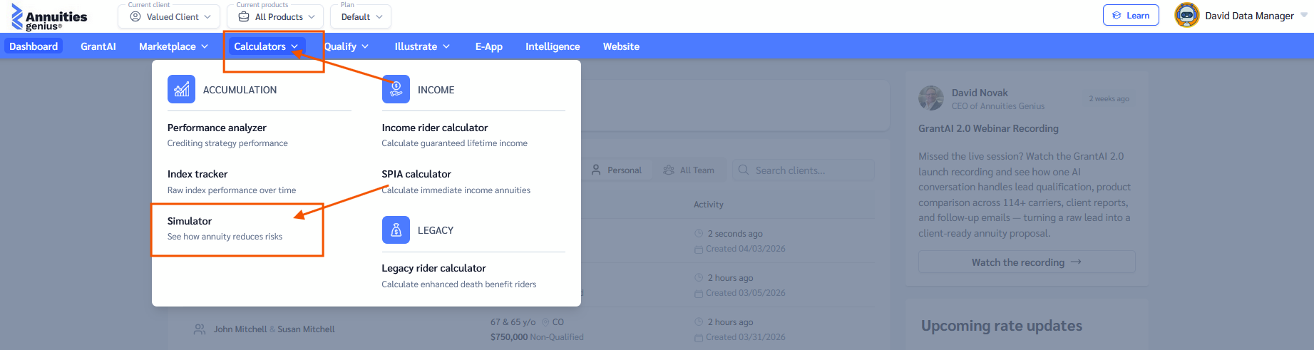 The Retirement Simulator is located under the Calculators tab in the blue navigation bar at the top of the screen. If it does not appear, it may not be included in your current plan — please contact us to discuss upgrading.