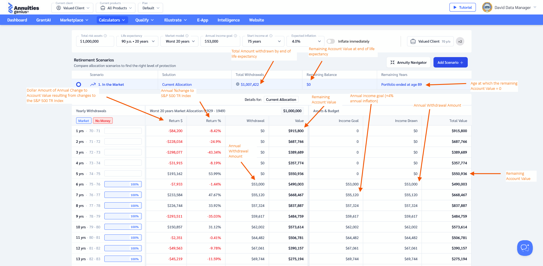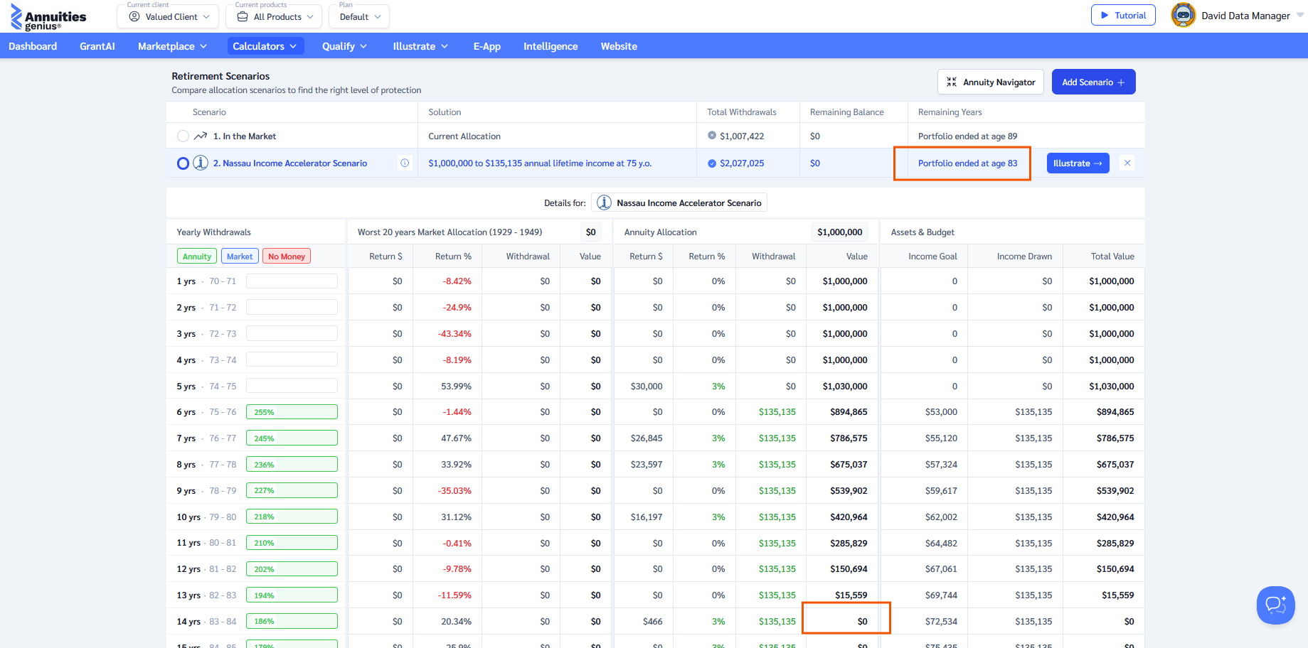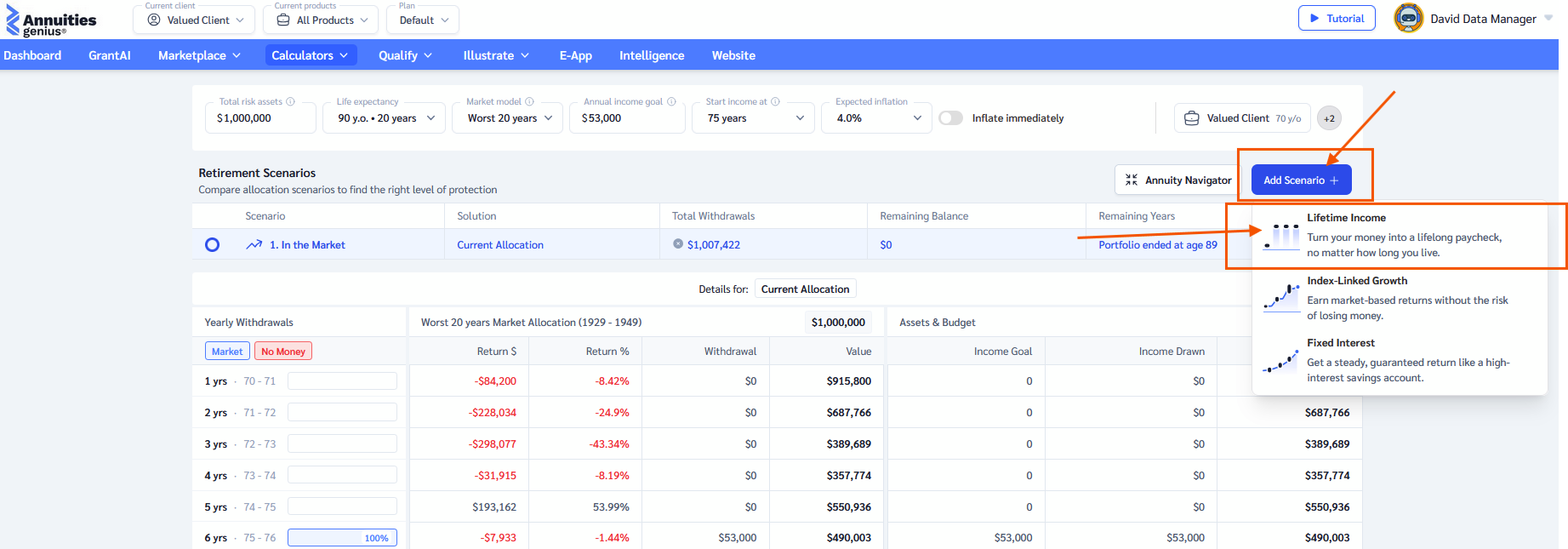 Agents can build one or more annuity scenarios to compare directly against the market projection.