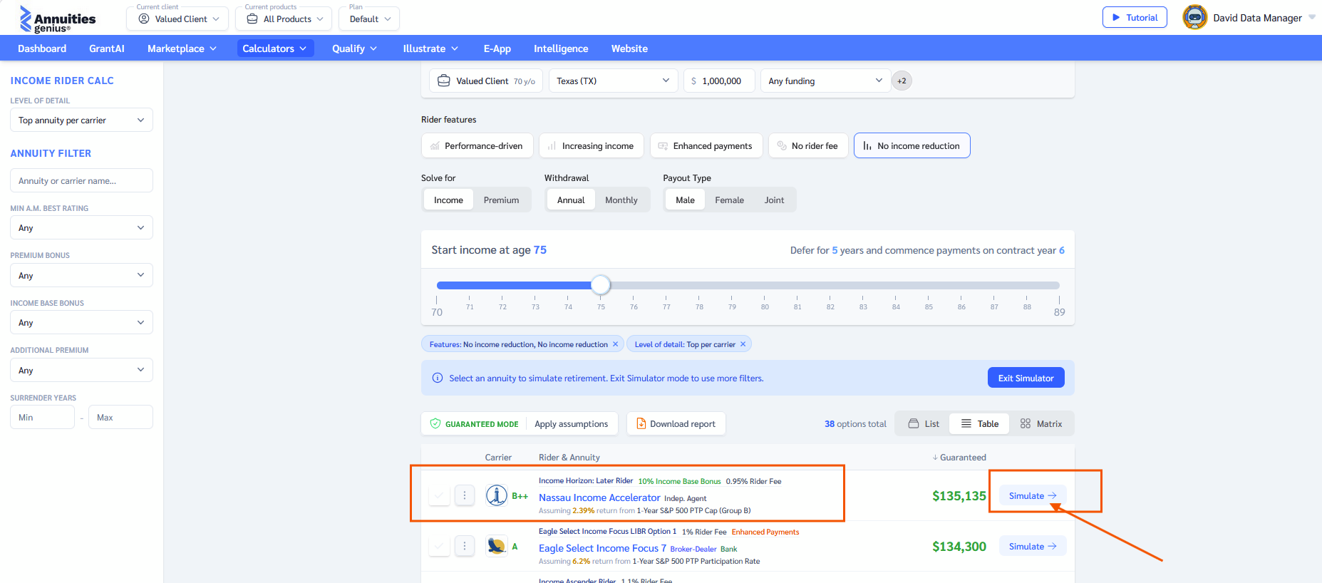 Note: The Simulator displays guaranteed income values only. Remember to always illustrate the annuity at the end of your client presentation.