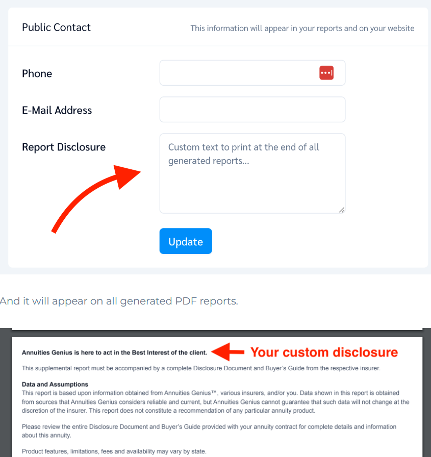 To add your disclosures, simply log into the system, click on the dropdown menu in the top right corner where your name is, and go to Settings. From there, you’ll find an option to add your disclosures. Anything you add will appear on your generated reports.