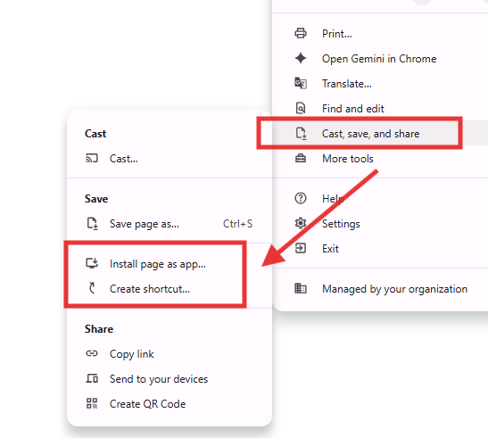 5. Click Create shortcut or Install page as app.