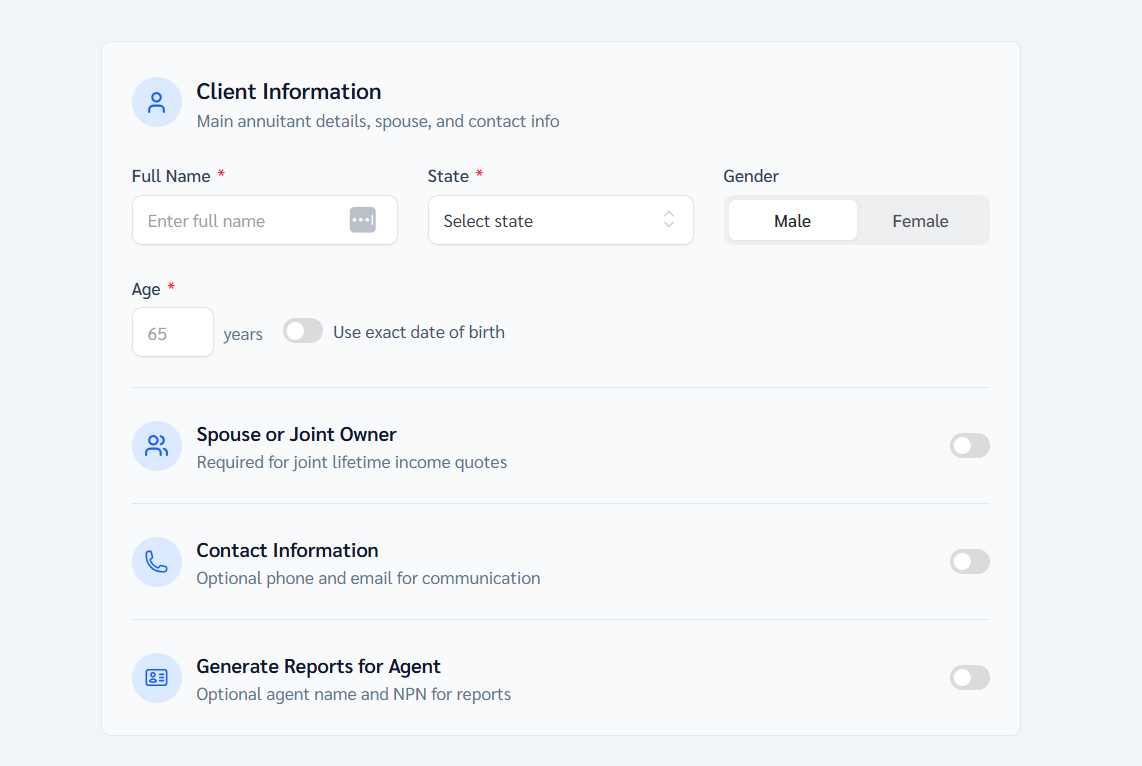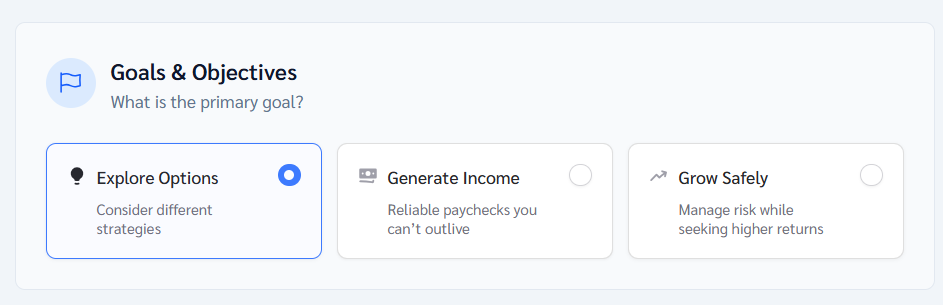 Use this when the goal is growth while protecting the client’s principal. Additional filters may appear for time horizon, liquidity needs, and optional product features such as Rate Lock-In, LTC Protection, or Legacy Focus.