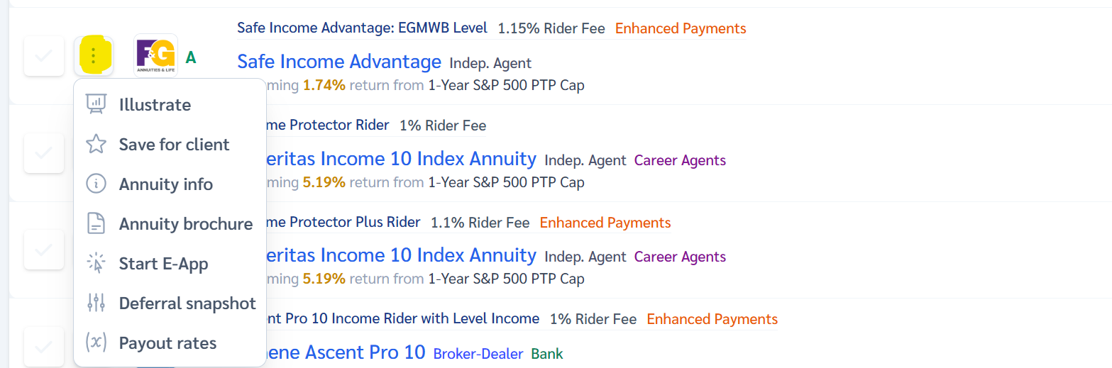 Open the action menu to access options like Illustrating or grabbing a brochure, finding more Annuity details.