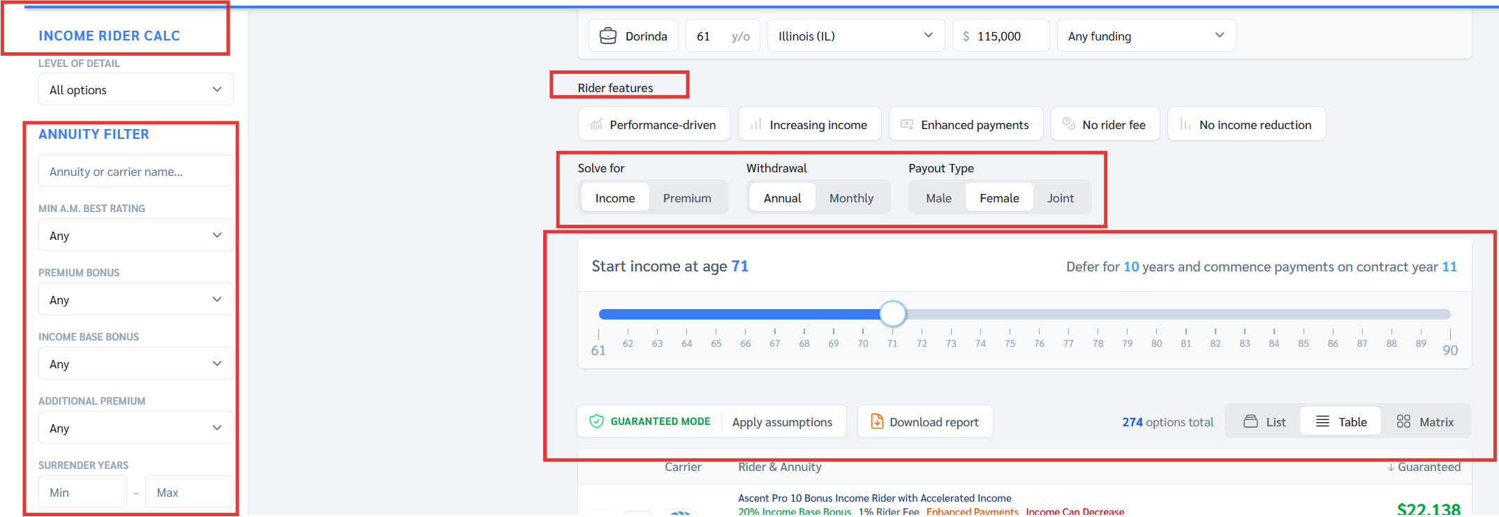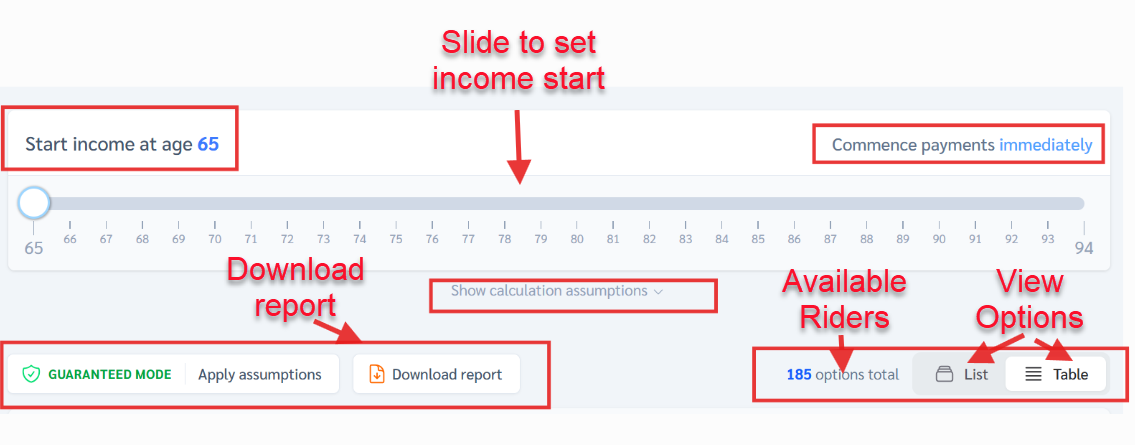 Next, you'll see the Income Rider Calculator, along with its various settings and features to help you make an informed decision.