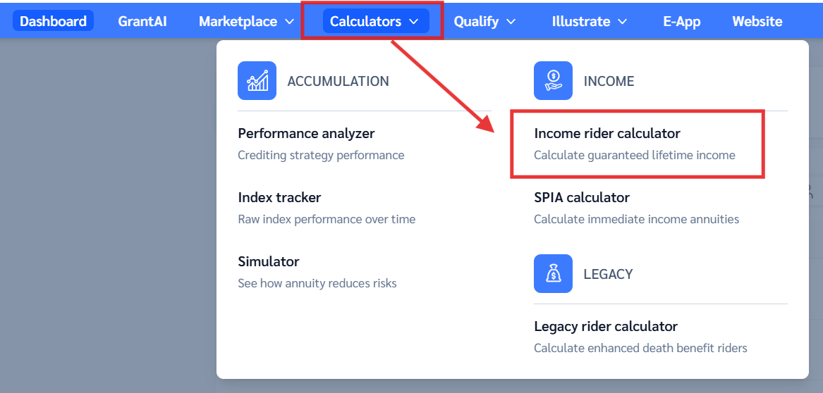 Click on the blue menu dropdown, select "Calculators," and then choose the "Income rider Calculator.