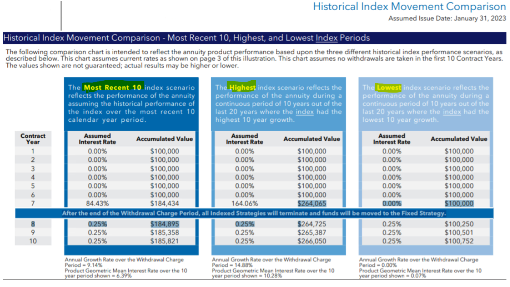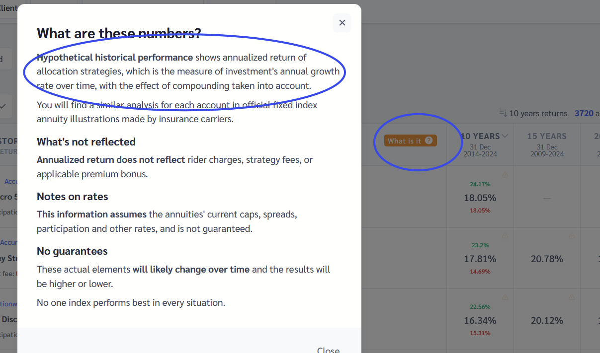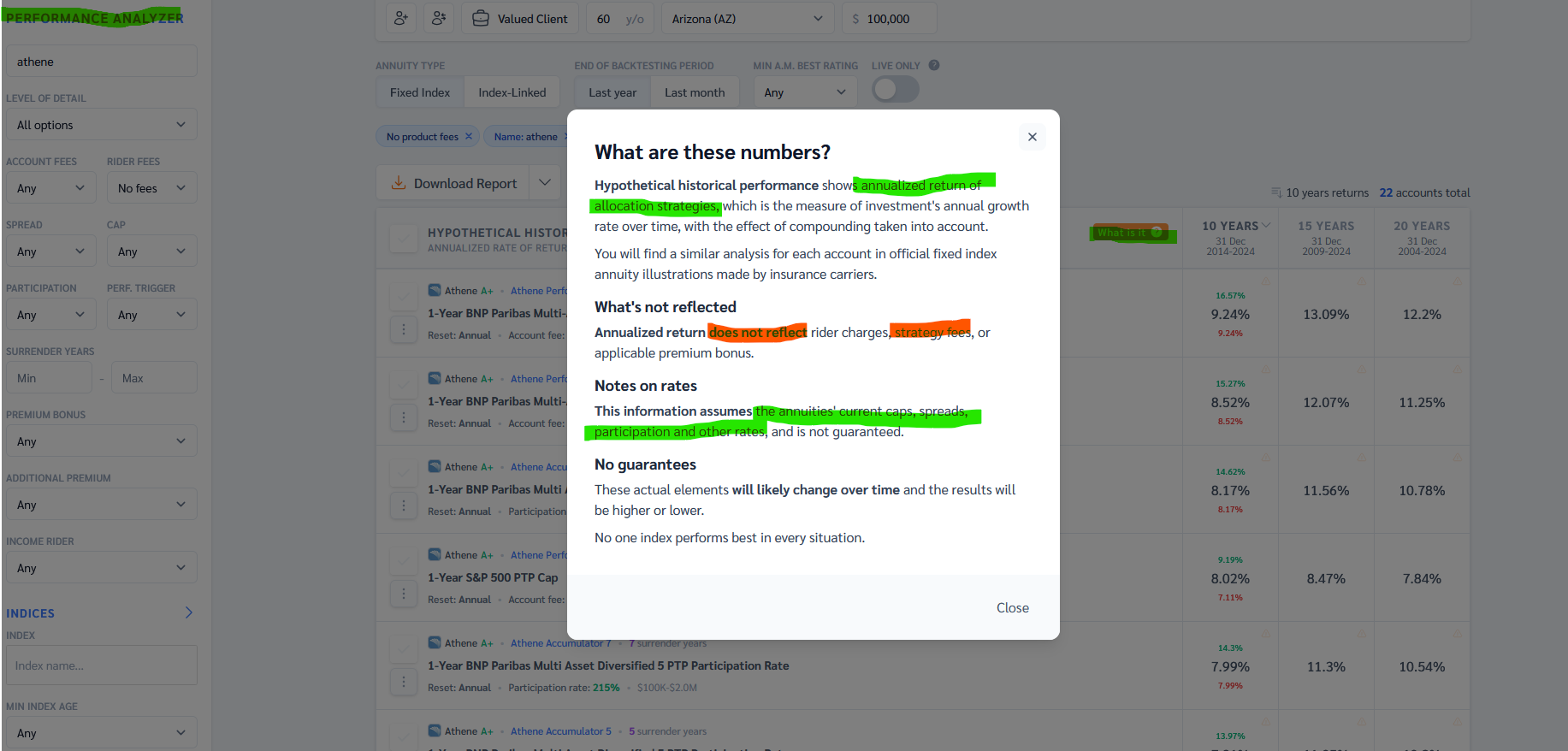 - The performance analyzer shows the historical performance of the indexed strategy including the index returns with the strategy rates (cap, spread, participation rates, etc.) applied. However it does not account for allocation fees. This is similar to the information you will find at the bottom of any carrier illustration that will show the (last-recent/best/worst) 10-year performance of any strategy you have allocated to.