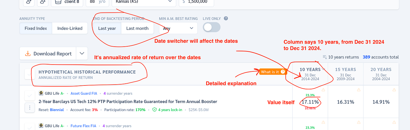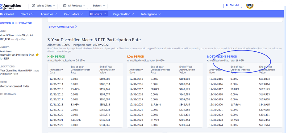 With our performance analyzer, you can instantly explore real-return annuity products using NAIC back testing or last month . Showcase various index options and their projected performance under different market conditions. Explain the reasoning behind your recommendation to support informed decision-making.