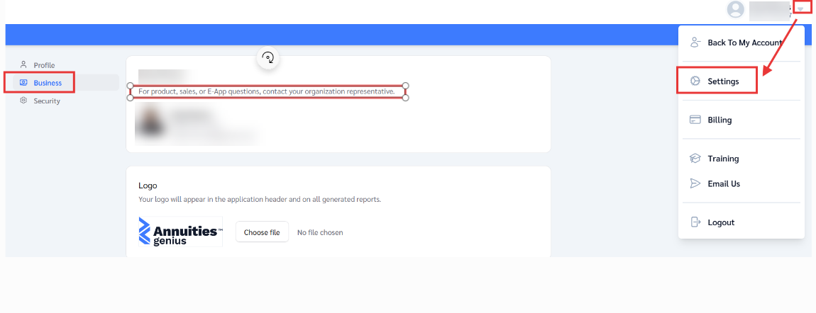 - For assistance, please contact your account administrator at your agency. This information can be found in the Business section within your settings. For inquiries related to products, sales, or eApp, your organization representative is the appropriate point of contact. Alternatively, you may access the portal directly via the following link: https://app.annuitiesgenius.com/settings?tab=business
