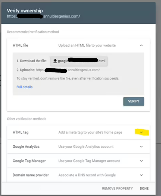 - Google Search Console will produce an owner verification pop-up like the one in the screenshot below