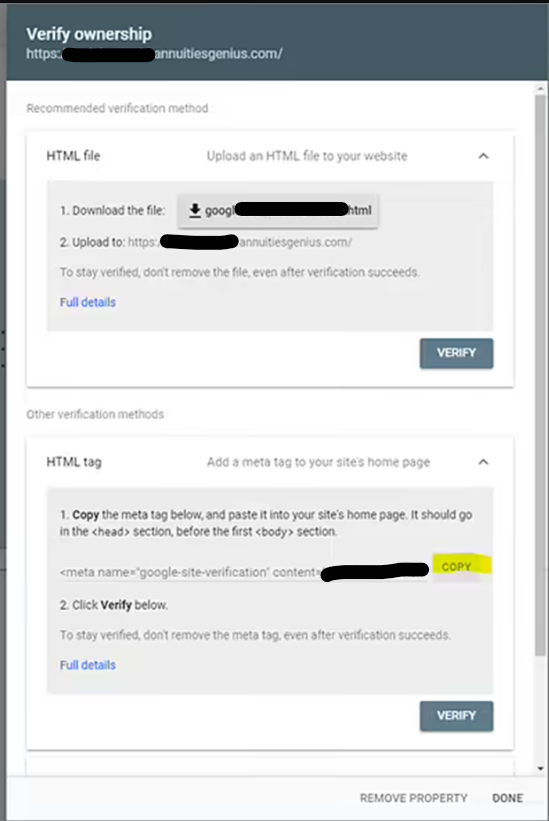 - Click "COPY" next to the HTML meta tag that the site produces