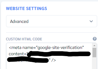 - Paste the HTML meta tag that you copied from the Google site into the "CUSTOM HTML CODE" text box