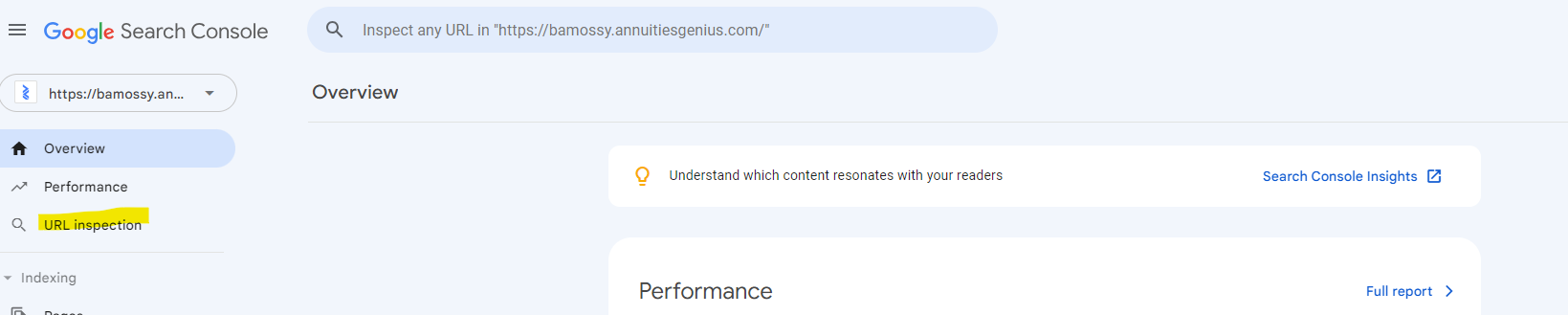 - Your Google Search Console account should now be open with your Annuities Genius Personal Website selected
