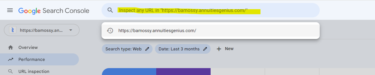 - Cut and Paste the address of your personal website (for example: https://bamossy.annuitiesgenius.com) into the URL prefix "Enter URL" text box that pops up on the google search console website