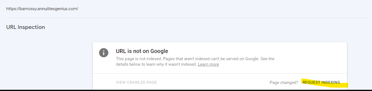 - click on "REQUEST INDEXING" in the pop-up window that opens on your screen