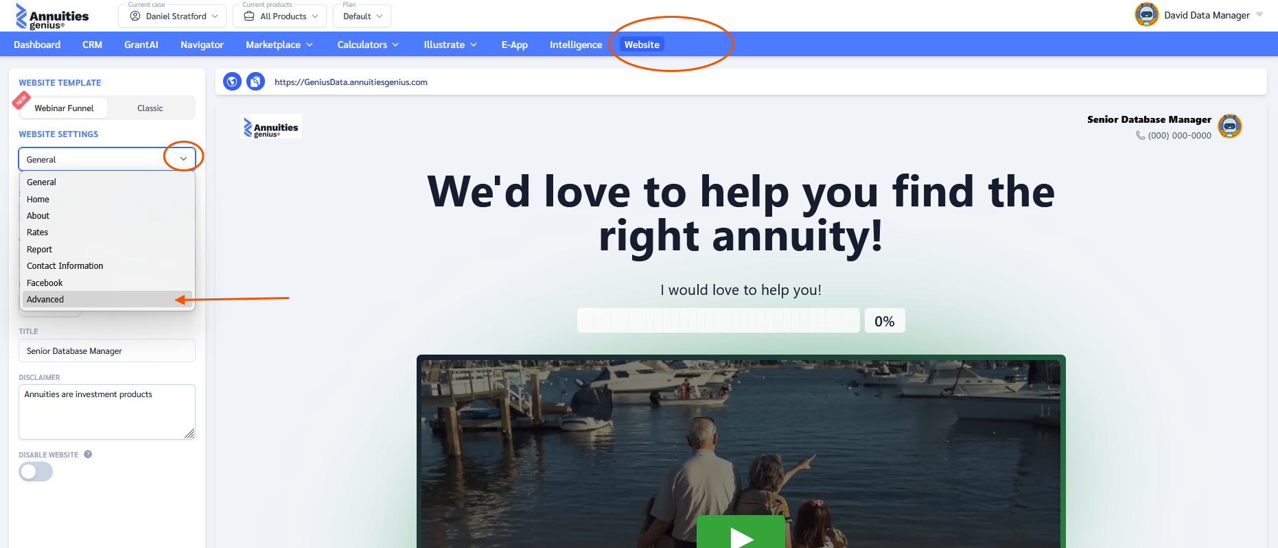 - Log in to Annuities Genius and open the "Website" tab in the blue menu at the top of the screen