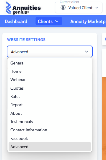 - Log in to Annuities Genius and open the "Website" tab in the "Clients" menu in blue at the top of the screen