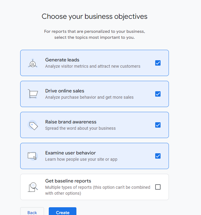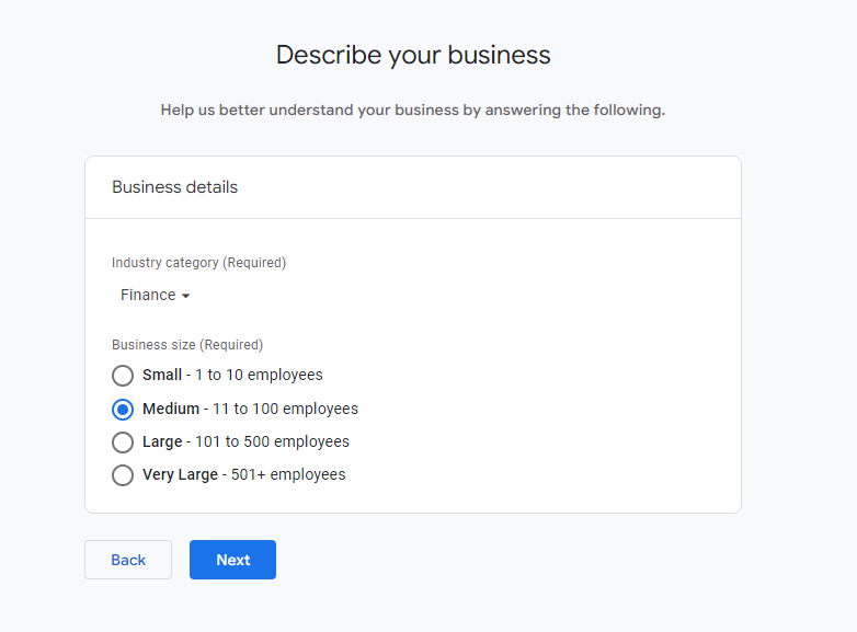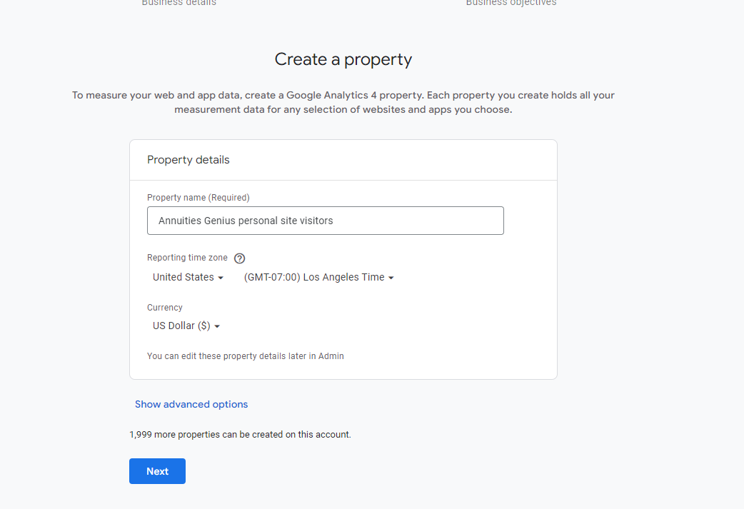 - Select a name for your property (such as "Annuities Genius personal site visitors"), select the time zone, then click "Next"