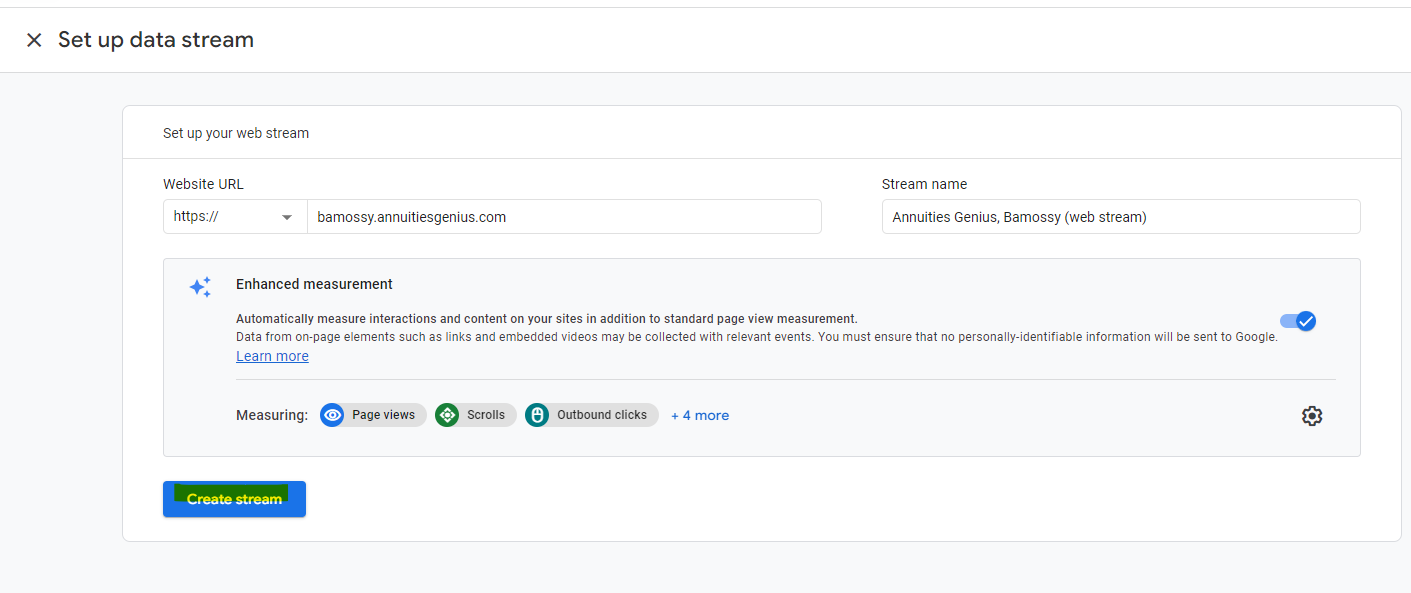 - last, Enter the URL of your personal website (for example: bamossy.annuitiesgenius.com) and add a Stream name (such as: "Annuities Genius, Bamossy (web stream)" and then click "Create stream"