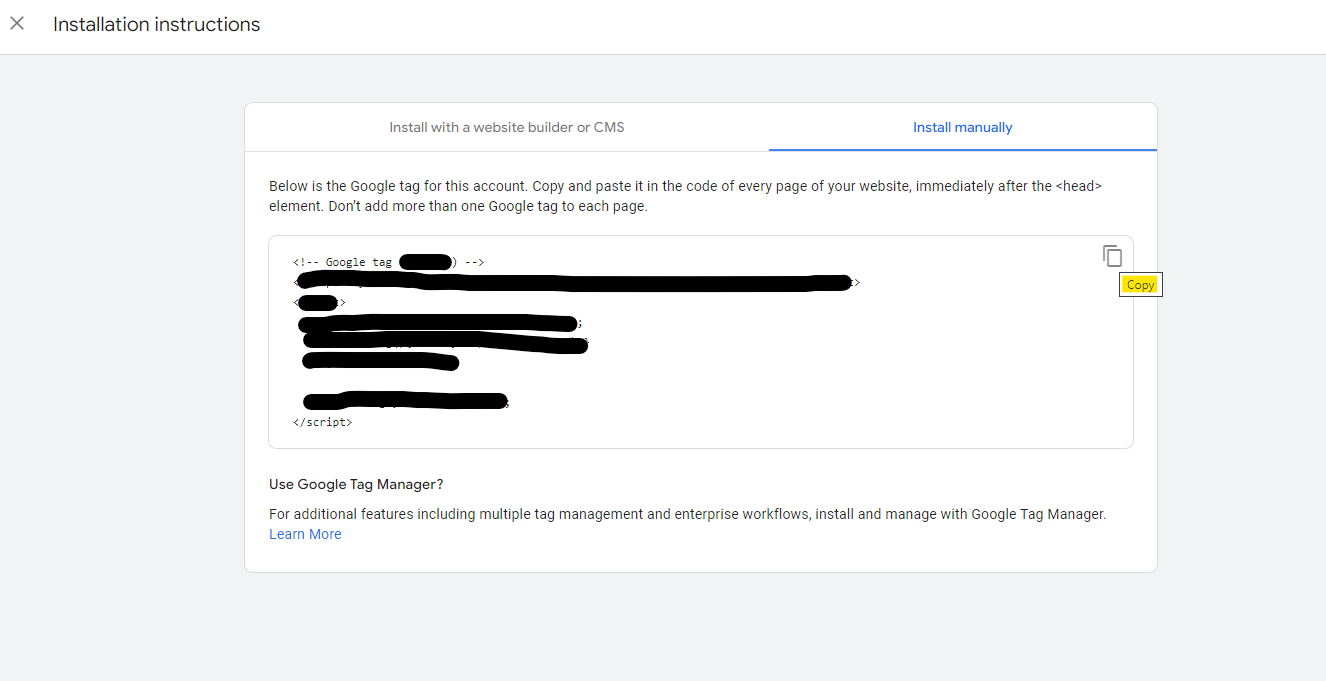 STEP 3: click the double-rectangle copy icon next to the google tag that pops up in the "Installation instructions" window