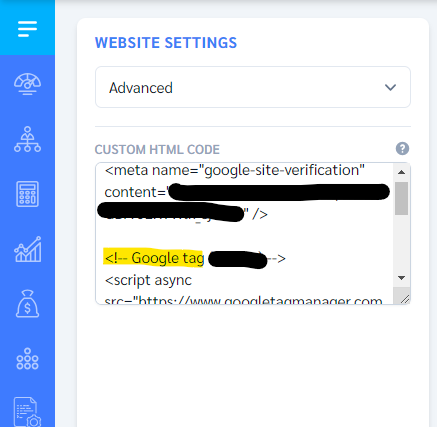 - select the "Advanced" tab in the "WEBSITE SETTINGS" drop down menu on the top left side of the screen