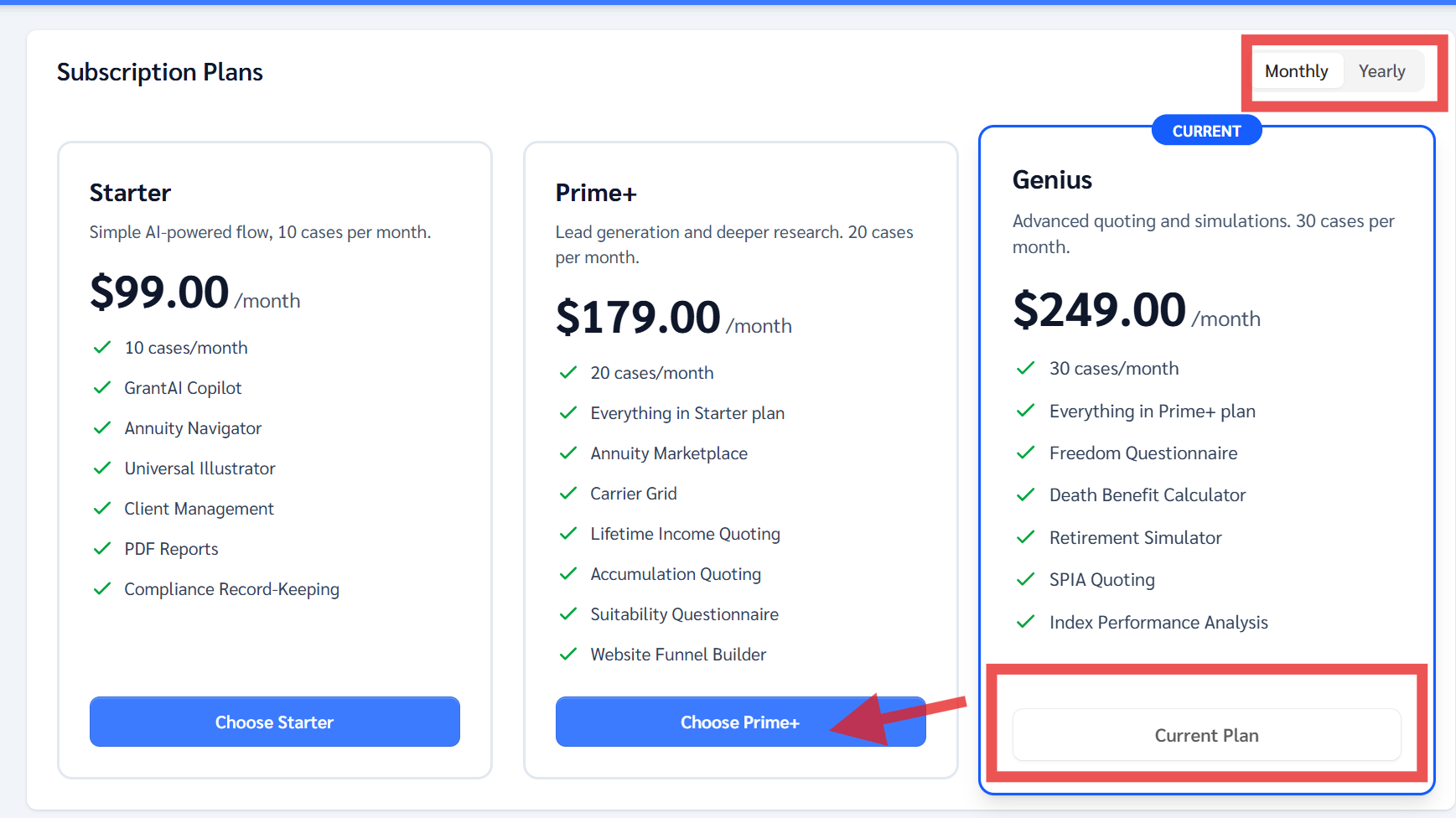 - Use the Monthly/Yearly toggle to switch between billing cycles.