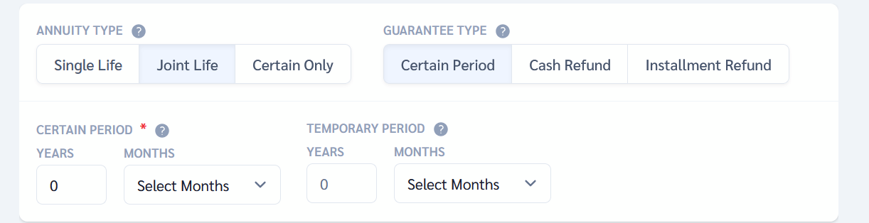 | Life with Period Certain | Single Life or Joint Life | Certain Period | Custom duration (Years and Months) |