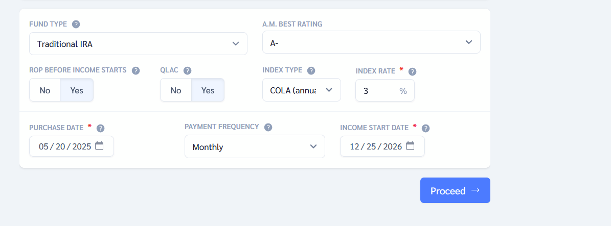 | Choose Inflation Adjustment | Decide if you want inflation-adjusted products (COLA) and set annual increase % | Index Type, Index Rate | COLA (annual), 3% |