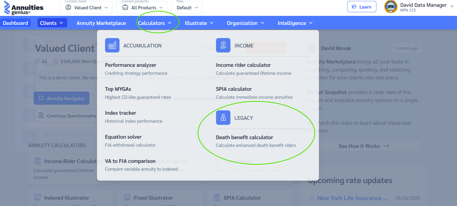 The EDB Calculator helps advisors quickly identify annuity products that offer the highest guaranteed death benefit for clients who are not taking income and want to maximize their legacy. It’s ideal for older clients investing a lump sum for legacy purposes.