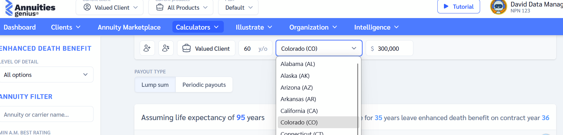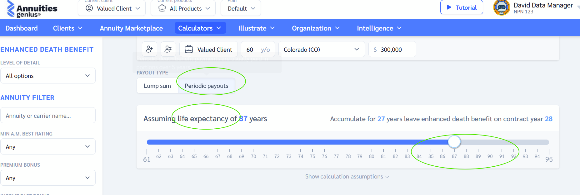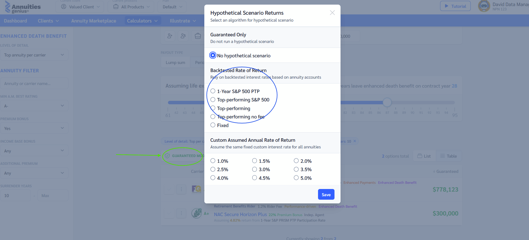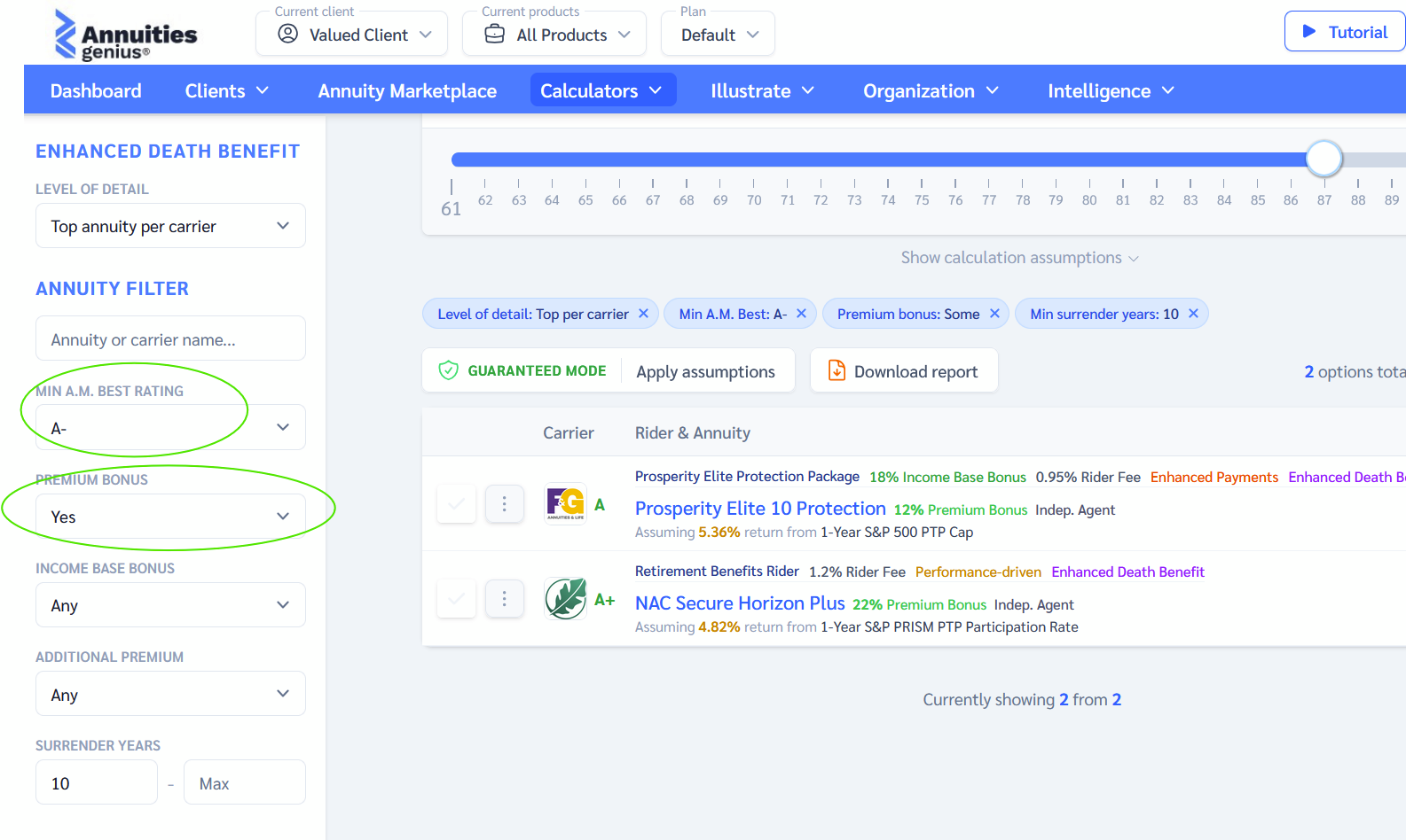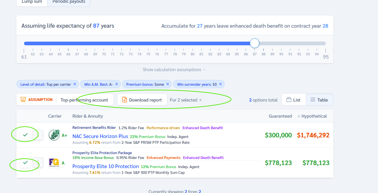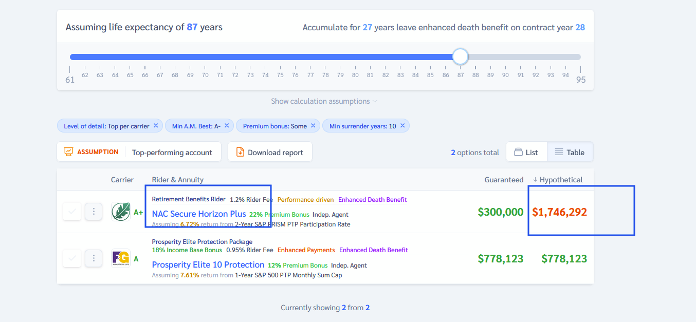 - The calculator instantly displays a ranked list of annuity products based on the total death benefit.