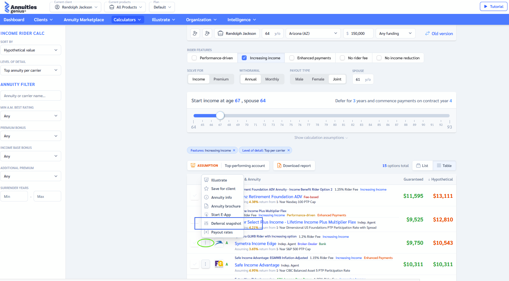 The deferral snapshot is a feature within the Income Rider calculator that enables agents to view projected income benefits at various deferral periods. This snapshot can be accessed through the action menu (three vertical dots) located to the left of each carrier/product in the Income Rider calculator. It assists in comparing potential income benefits based on different deferral durations.
