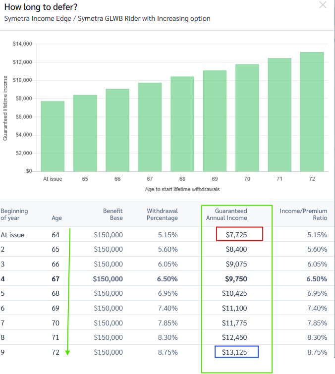 The Guaranteed Annual Income is the fixed amount of income that the client will receive each year once they start taking withdrawals. This amount is guaranteed by the annuity provider and is calculated based on the Benefit Base and the Withdrawal Percentage.