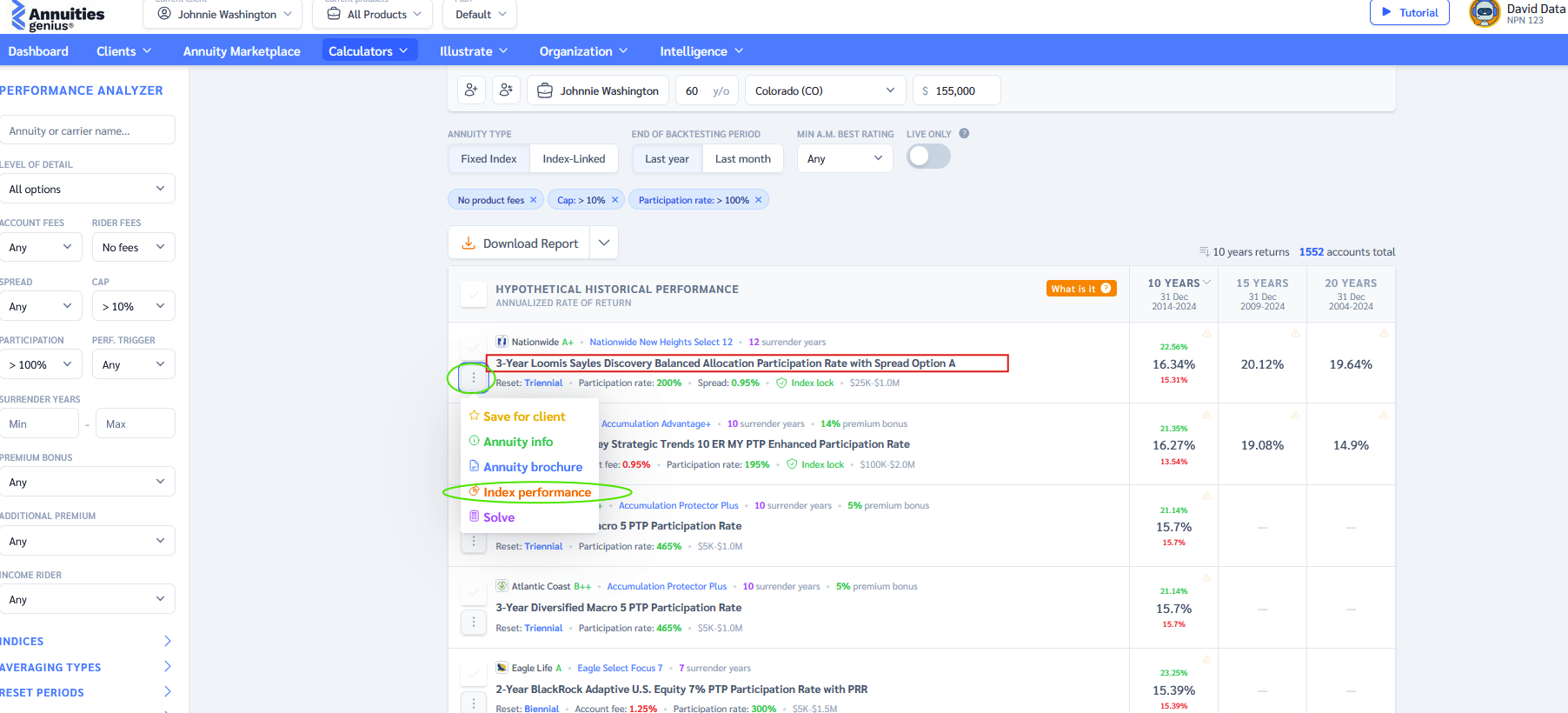 Typically, returns in the Performance Analyzer take into account various annuity strategy characteristics such as caps, spreads, participation rates, calculation methods (e.g., annual point-to-point), and duration (e.g., 5-year). However, an advisor may wish to quickly review the underlying index itself to assess its performance, history, and other relevant details.