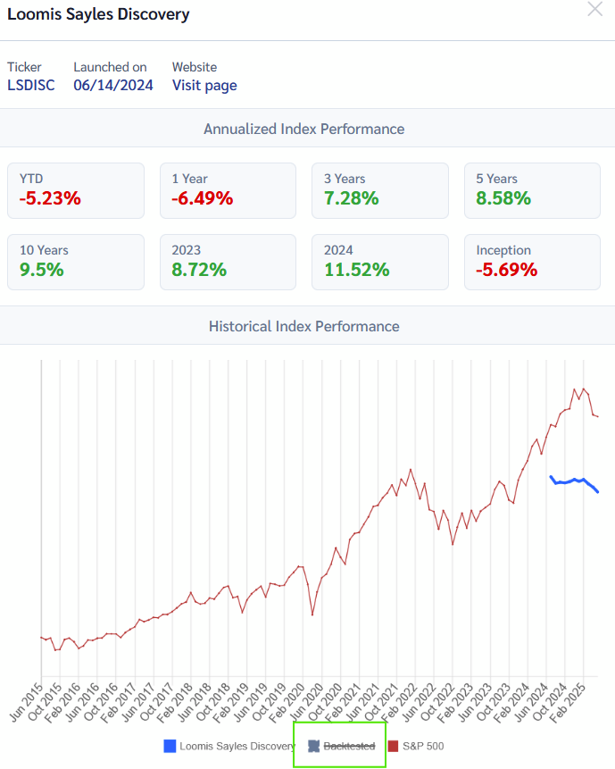 If you want to remove some of the information in the chart (such as the index returns, backtested index returns, or S&P 500 data), simply click the data you wish to remove in the legend [or re-click to add it back].