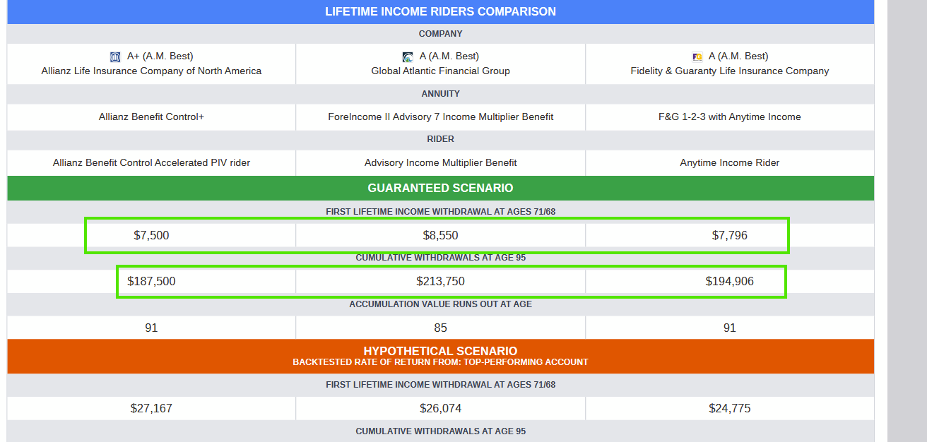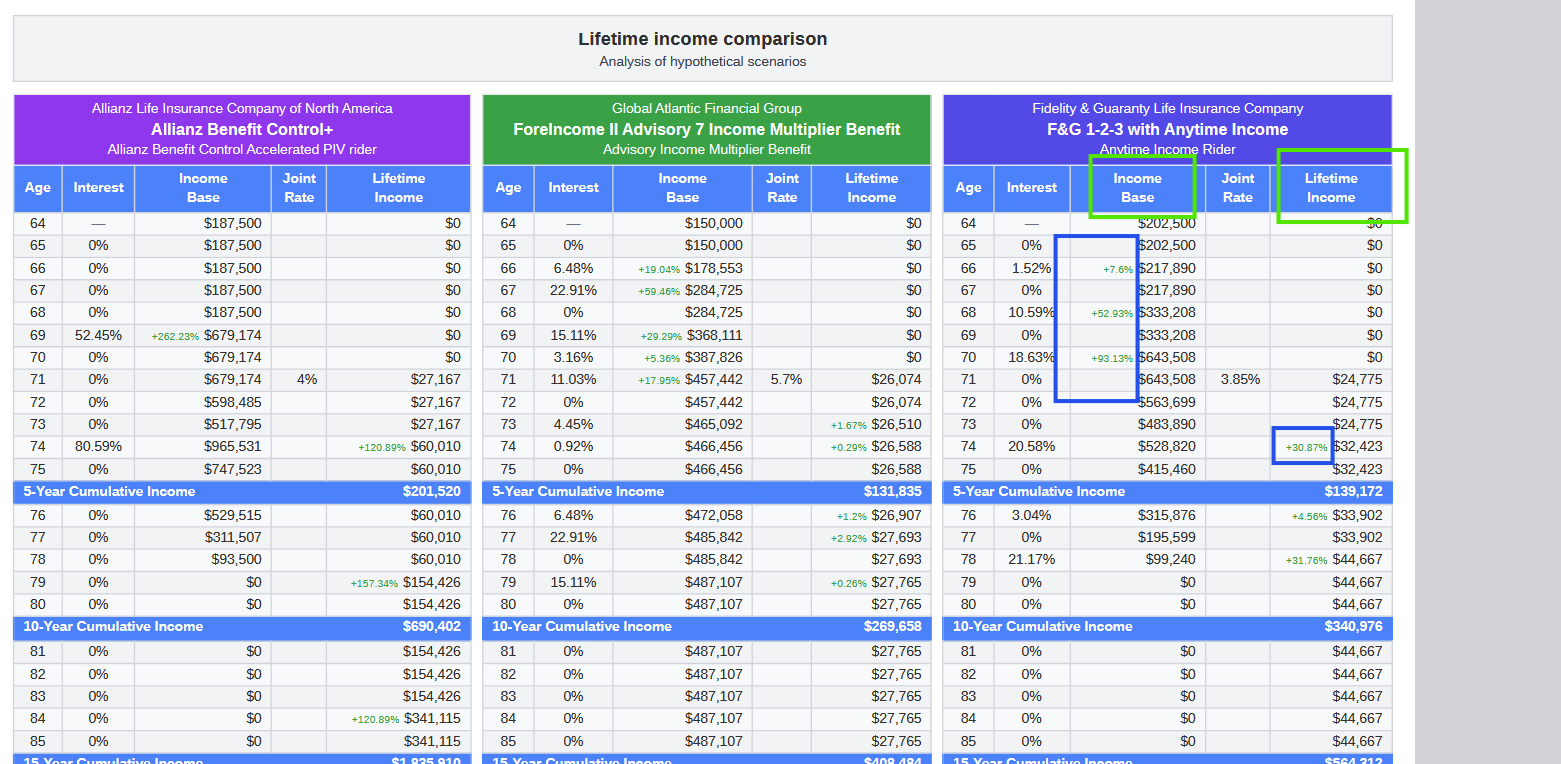 This report provides a comprehensive, side-by-side comparison of annuity products with income riders. It’s designed to help you evaluate how each product performs over time in terms of income generation, benefit base growth, and overall value.