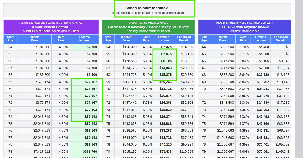 - Shows each product’s annual lifetime income amount starting at the selected income age.