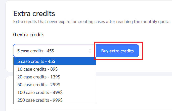 If your monthly credits run out, you have options. You can upgrade to a higher plan that includes more monthly credits, or you can purchase additional case credits at any time. There are no automatic charges, and you remain in full control.