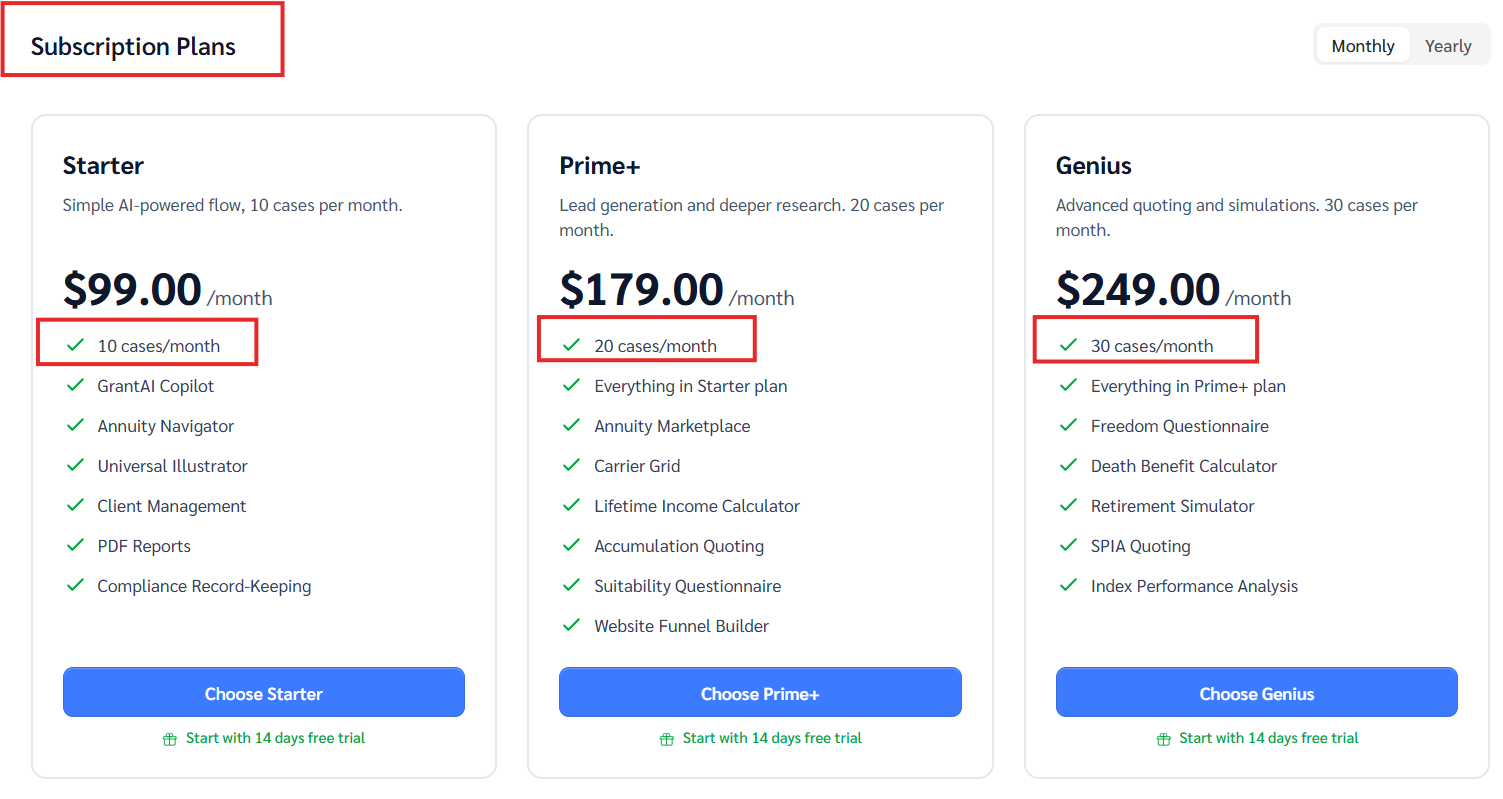 This is our usage-based pricing for additional client case credits -$9.00 per one credit. Each credit unlocks a new client profile, with unlimited reports and case designs within that profile.