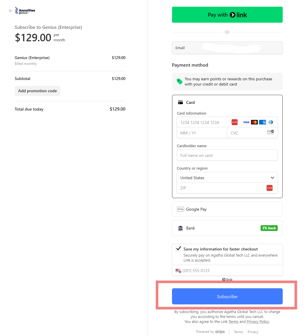 - Enter your payment information, and click Subscribe to activate your trial or subscription.