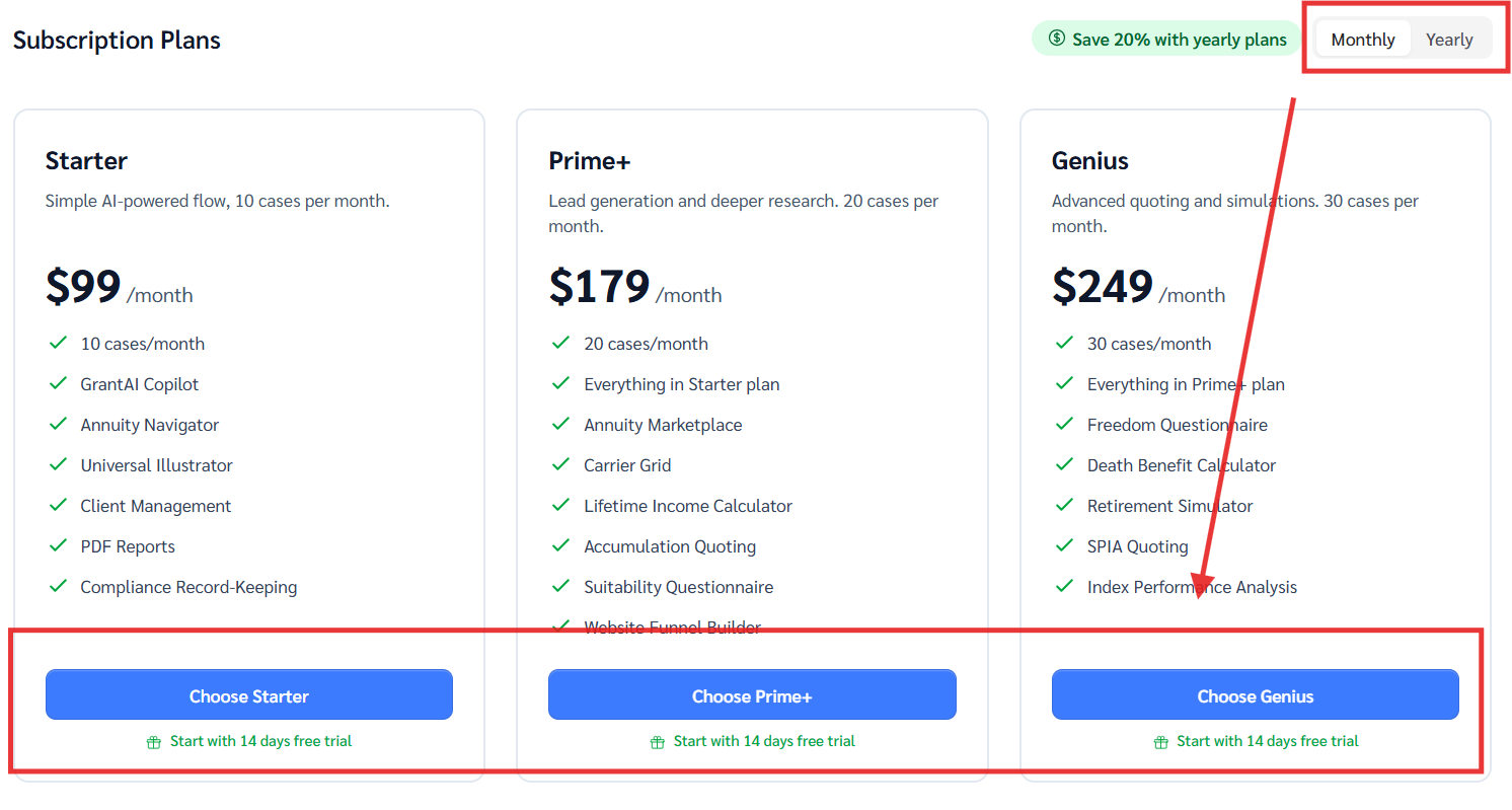 Select the plan that best fits your needs. Use the light gray toggle in the top right corner to switch between Monthly or Yearly billing.