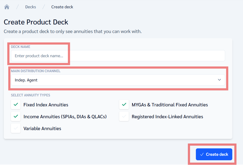 - Give your deck a name and choose your main distribution channel (e.g. Independent Agent).