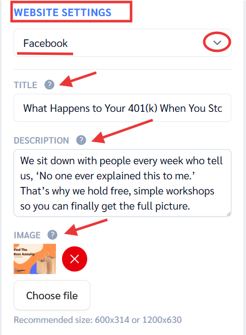 Whether you select Webinar Funnel or Classic, the social media preview settings (Title, Description, and Image) function the same way.