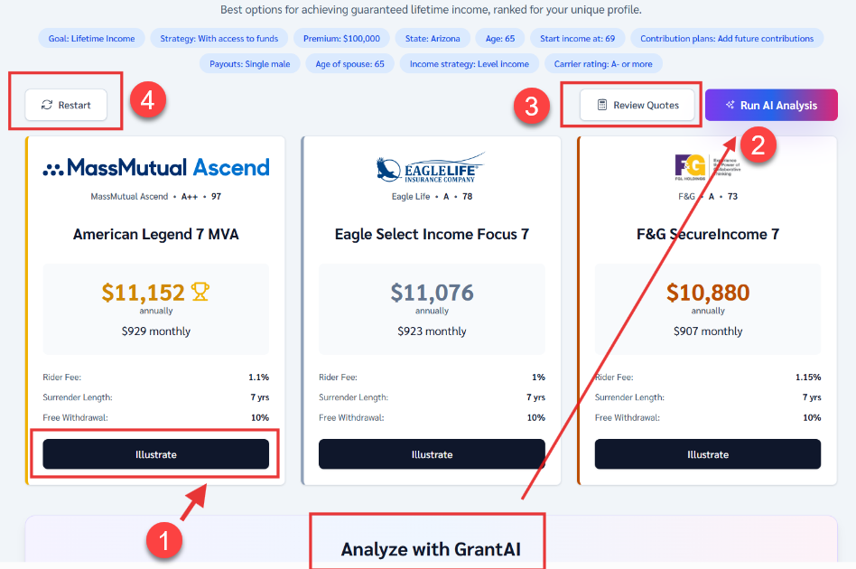 Review the top annuity options based on your inputs. From here, you can explore each option further or run additional analysis.