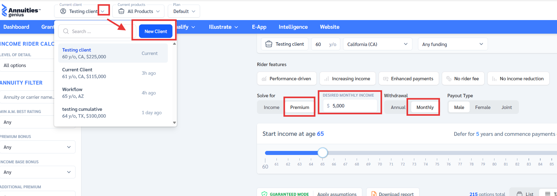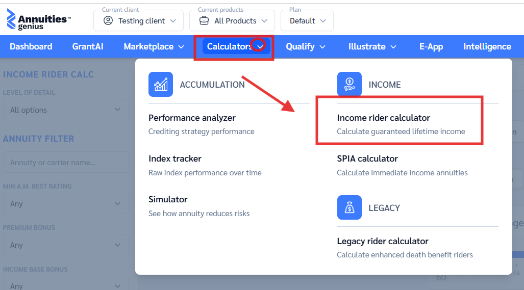 - From the top navigation, go to Calculators → Income Rider Calculator.