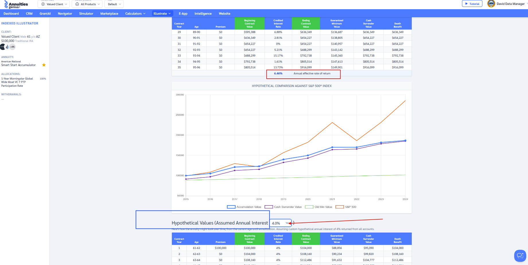 Note: Annuities Genius does not currently display renewal rates. However, in the illustrator, you can add a section after the Guaranteed and Hypothetical values to demonstrate how the product might perform using an assumed interest rate. This can provide a realistic example of potential outcomes if renewal rates are lower: