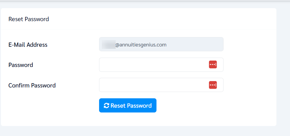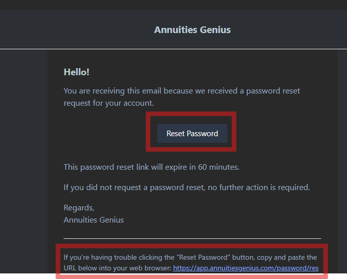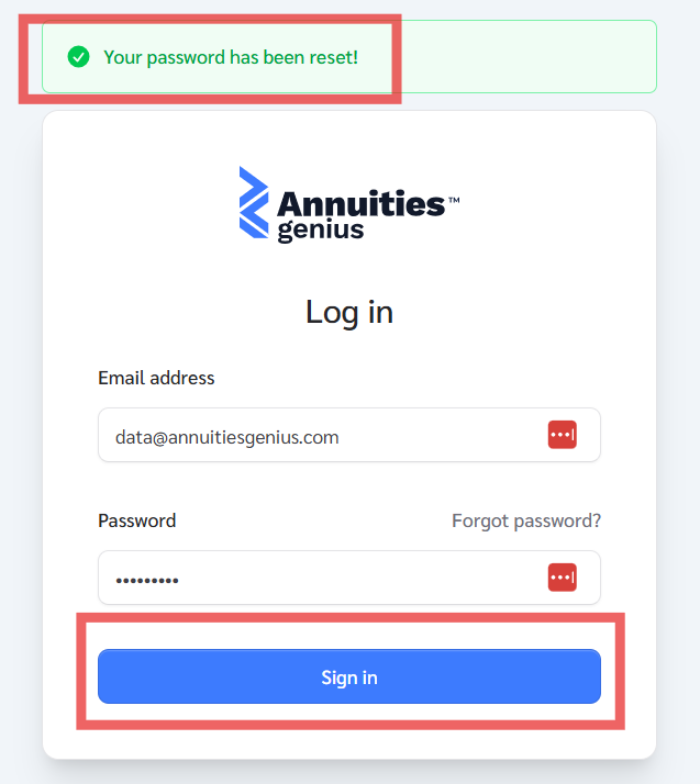 The email will include detailed instructions to complete the reset process. If it does not appear in your inbox, please check your spam or junk folder. If you’re still unable to locate it, please contact your IT team to ensure emails from Annuities Genius are not blocked and to add us to your safe sender list.