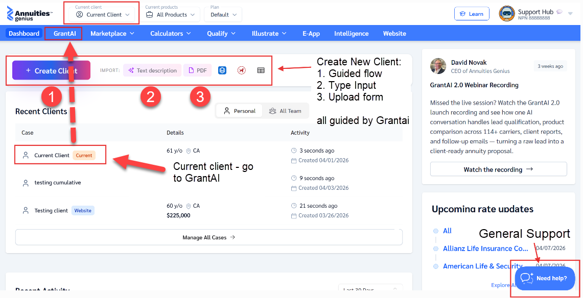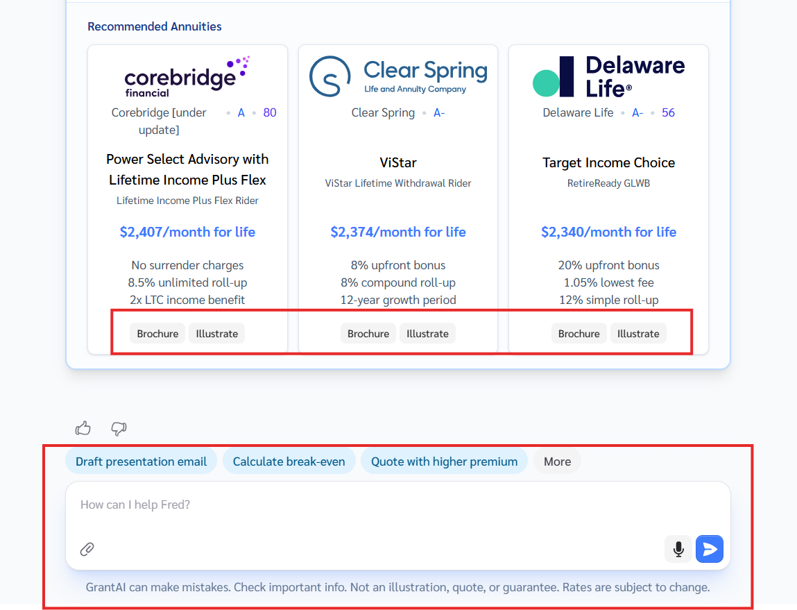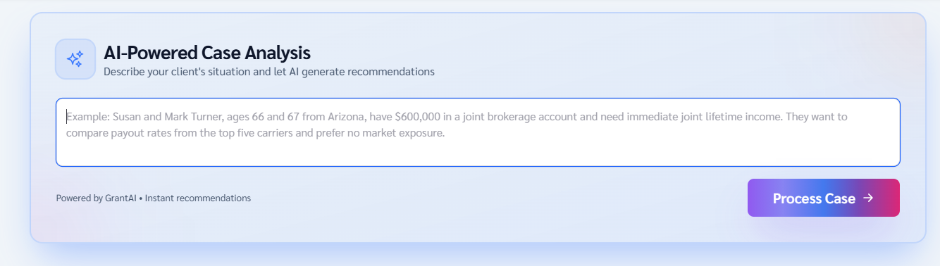 GrantAI is your AI assistant within Annuities Genius, designed to make case design faster, simpler, and more efficient. It guides you step by step to help you find suitable products, strategies, and client recommendations with confidence.