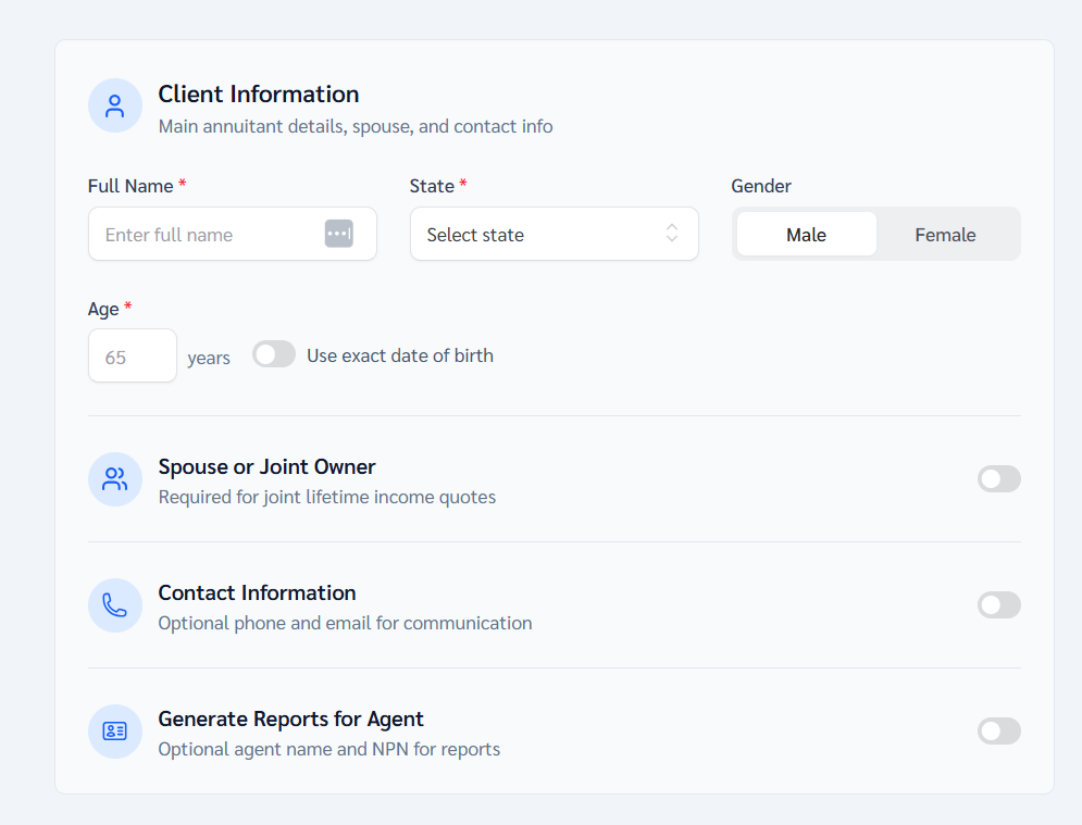 - Client goals – Income generation, principal protection, Social Security supplement, accumulation, or bridge to Medicare