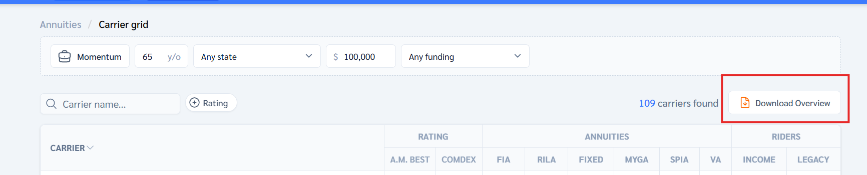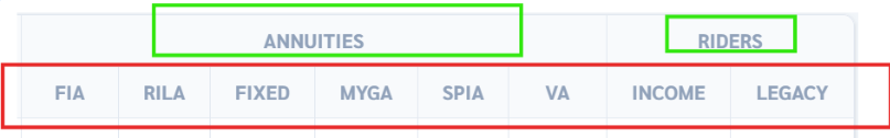 - Each carrier row shows annuity types only (not individual product names)